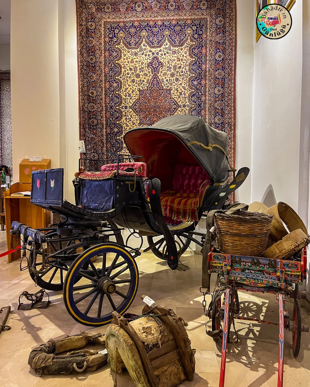 Kadife kaplamalı atlı arabanın kırmızı ve sarı çizgileri, geleneksel ulaşım araçlarının estetik değerini ortaya koyar. Arkadaki zengin halı, bu tarihi aracın sergilendiği atmosferi tamamlar. Müzenin geniş sergileme alanları, böylesine büyük eserlerin rahatça sunulmasına olanak tanır. Bu özel düzenleme, etnografya koleksiyonunun çeşitliliğini gözler önüne serer. Geçmişin ulaşım kültürü, modern müzecilik anlayışıyla buluşarak yaşatılır.