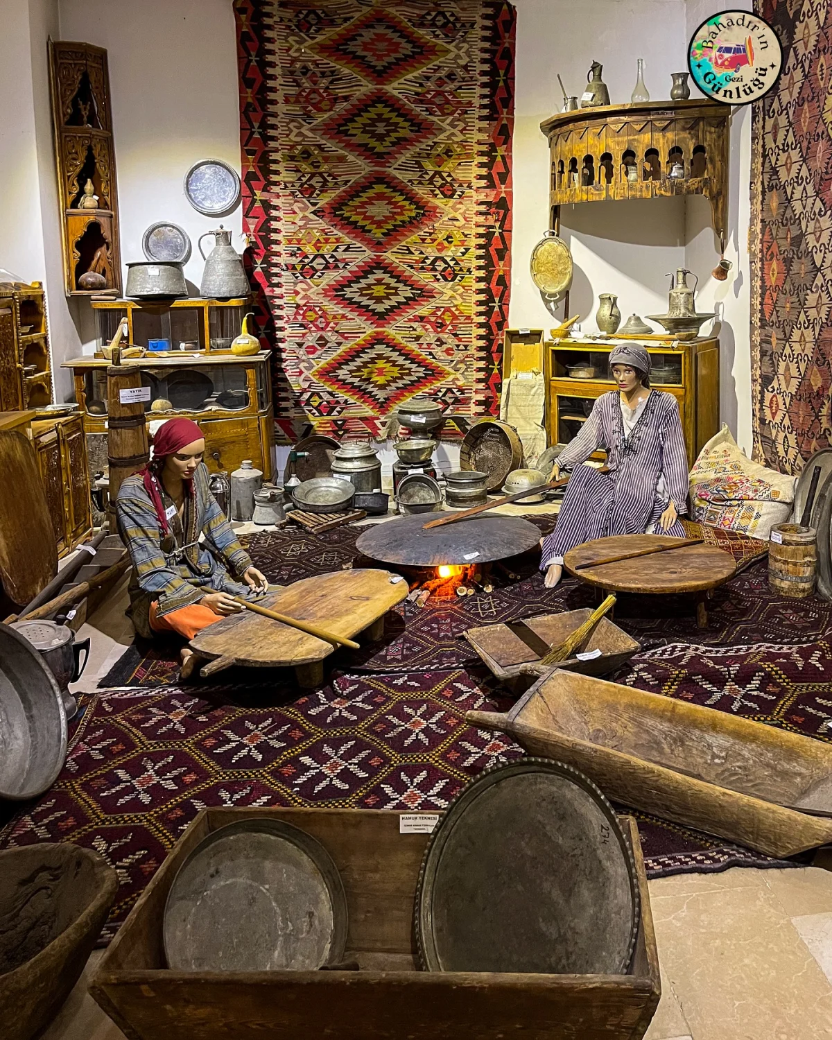 Yuvarlak ahşap masalar etrafında geleneksel kıyafetli kadın figürleri, eski yaşam tarzını canlandırır. Bu sahne, etnografya müzesinin eğitici misyonunu mükemmel şekilde örnekler. Eski ev eşyaları ve yöresel objeler, Anadolu insanının günlük yaşamına ışık tutar. Müzenin interaktif sergileme anlayışı, ziyaretçilere geçmişe yolculuk imkanı sağlar. Her yıl 50.000 kişinin ziyaret ettiği bu özel mekan, kültürel aktarımda önemli görev üstlenir.