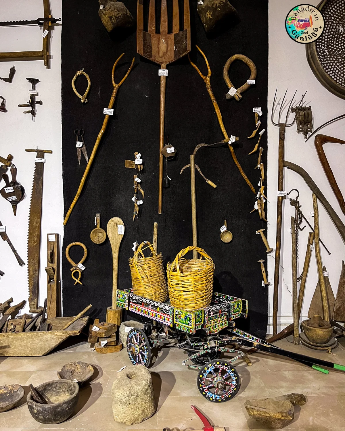 Duvara özenle asılmış geleneksel tarım aletleri, kırsal yaşamın vazgeçilmez unsurlarıdır. Siyah örtü üzerindeki bu düzenleme, el yapımı objelerin sanatsal değerini vurgular. Her aletin kendine özgü işlevi, Anadolu insanının yaratıcılığını belgeler. Bu koleksiyon, müzenin etnografik zenginliğinin sadece küçük bir bölümüdür. Geleneksel üretim araçları, modern teknoloji öncesi dönemin yaşam tarzını canlı şekilde anlatır.
