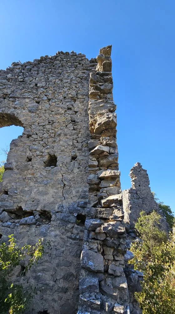 Eski taş yapının kalıntılarında, duvarında çerçeve şeklinde bir boşluk bulunuyor. Etrafındaki taşlardan oluşan duvar yapıları, zamanla erimesine rağmen sağlamlığını koruyor. Bu mimari detay, erken Bizans taş işçiliğinin inceliklerini gösteriyor. Köşe noktalarındaki kulelerin savunma gücünü artırdığı dönemlerden kalan bu parça, tarihi sürekliliğin somut kanıtı.