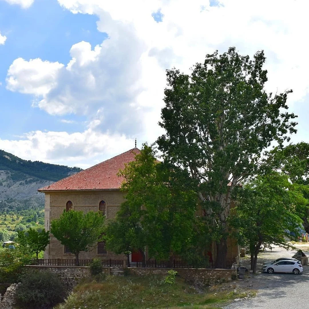 Yeşil ağaçlarla çevrili büyük taş bina, keskin kenarları olan çatısıyla dikkat çekiyor. Kırmızı tuğlalarla kaplanmış bu yapı, kalenin çevresindeki mimarî gelişimin izlerini taşıyor. Önündeki ağaçlar ve çalılık alan, doğal güzelliklerin tarihi yapılarla uyumunu gösteriyor. Bu bölge, Selçuklu döneminden günümüze kadar farklı medeniyetlerin izlerini barındırıyor.