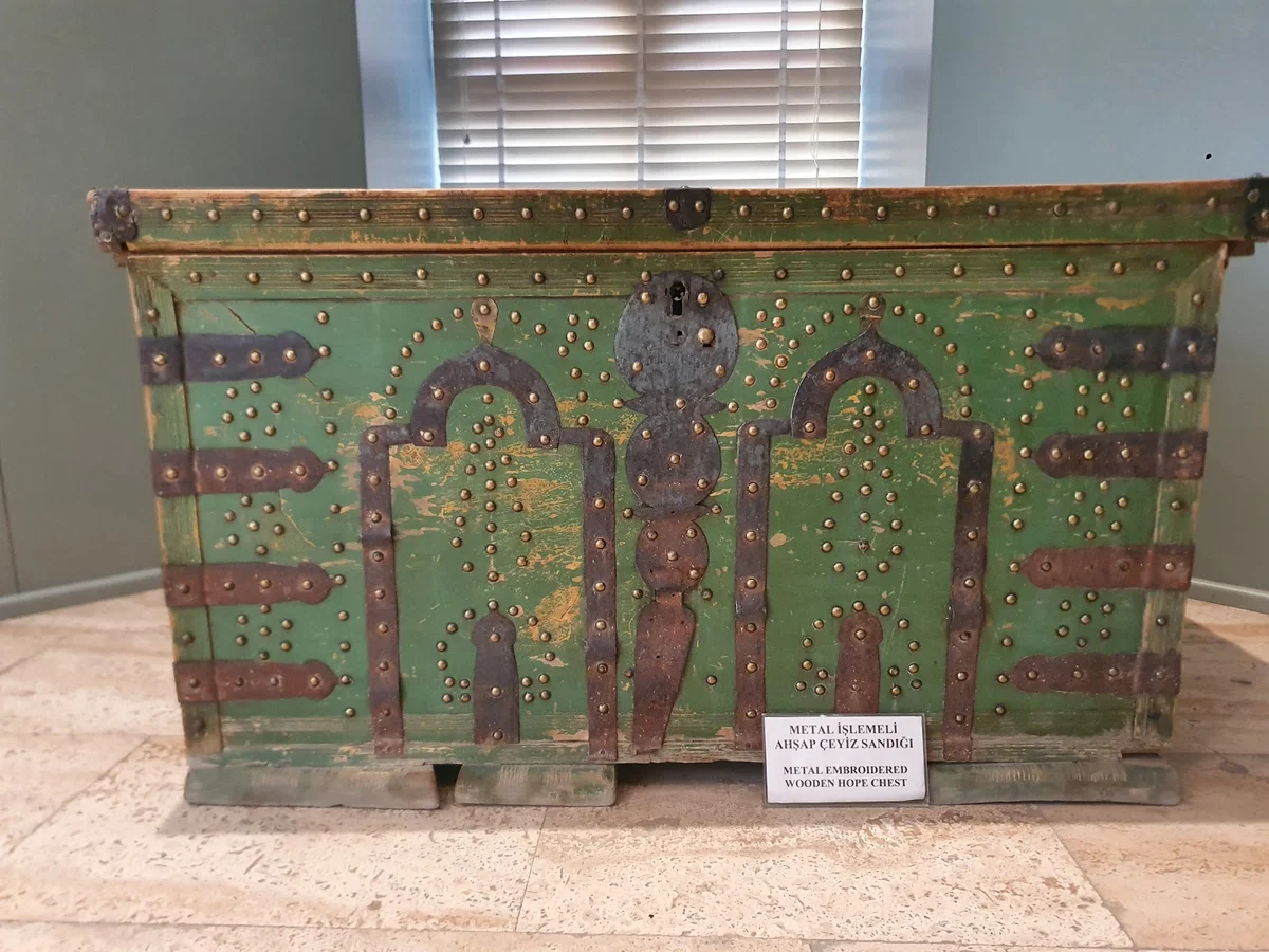 Yeşil ahşap sandığın üzerinde metal parçalar ve çiviler özenle yerleştirilmiş. Ön yüzeydeki biçimlendirilmiş detaylar, geleneksel el işçiliğinin inceliğini gösteriyor. 144 etnografik eserin arasında yer alan bu sandık, Uluborlu'nun günlük yaşam kültürünü yansıtıyor. Her metal parça, bir ustanın emeğini taşıyor. Zemin veya birinci kattaki vitrinlerde böyle hazineler keşfedilmeyi bekliyor.