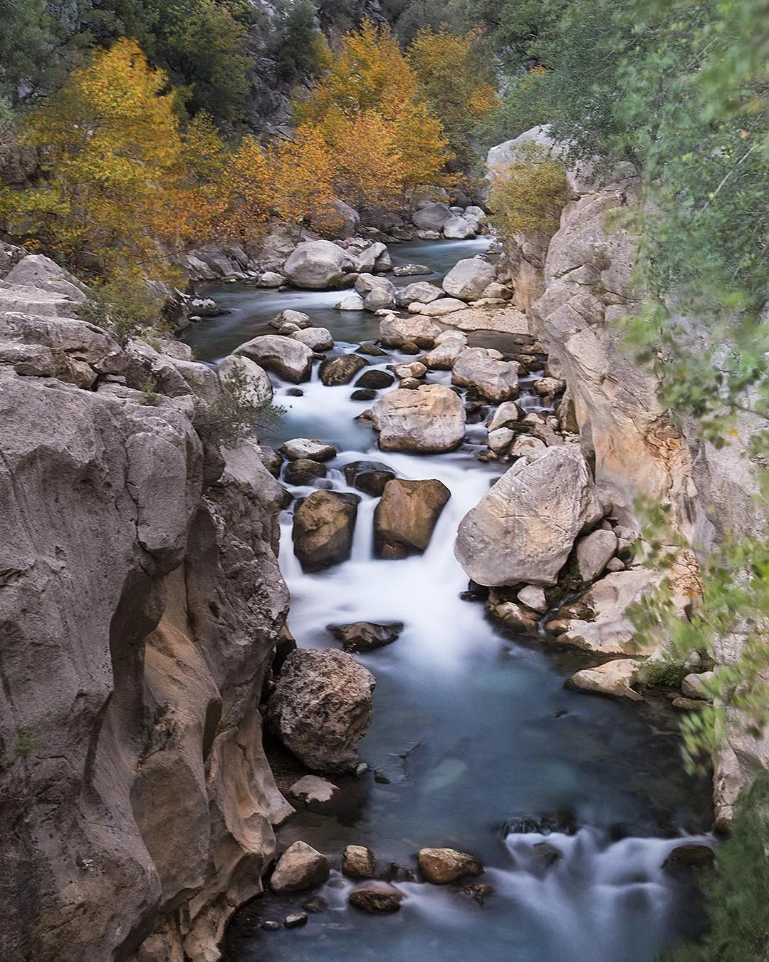 Kayalık vadiden akan serin nehir, büyük ve küçük taşlarla etkileşim halinde akıyor. Vadi boyunca sarı ve yeşil yapraklı ağaçlar, mevsimsel değişimin güzel bir örneğini sergiliyor. Suyun akışıyla taşların oluşturduğu doğal müzik, kanyonda huzur dolu anlar yaşatıyor. Bu bölge, kaya tırmanışı ve kampçılık aktiviteleri için ideal koşullar sunuyor. Nehrin kenarında dinlenirken, garrulus glandarius (alakarga) ve apus apus (ebabil) gibi kuş türlerini gözlemleme fırsatı bulabilirsiniz.