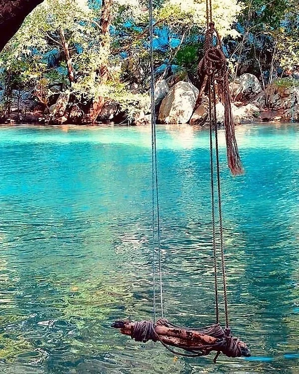 Kristal berraklığındaki turkuaz suda asılı salıncak, kanyonun en popüler fotoğraf noktalarından biri. Doğal malzemelerle yapılmış bu salıncak, ağaca güvenli şekilde asılmış. Çeşitli renklerdeki doğal unsurlarla çevrili bu alan, hem eğlence hem de unutulmaz anılar için mükemmel. Suyun şeffaflığı o kadar yüksek ki, dibindeki taşları net şekilde görebiliyorsunuz. Modern doğa turizminin en güzel örneklerinden biri.