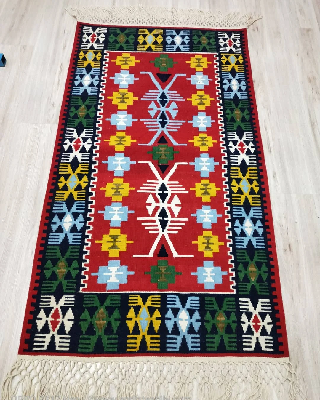 Grubun başlangıcında canlı zeminiyle dikkat çeken bir kilim seriliyor; mavi, yeşil, sarı ve beyaz geometrik motifler dengeli şekilde yerleşmiş. Ortalama dokuma yoğunluğu ve doğal boyaların nüansları görünür. Bilgi notu: burası Karatepe – Kızyusuflu Köyü Kalkındırma Kooperatifi, Osmaniye, Kadirli, Sarıdüz Mahallesi; köylü kadınların el emeğiyle dokunan bir eser.