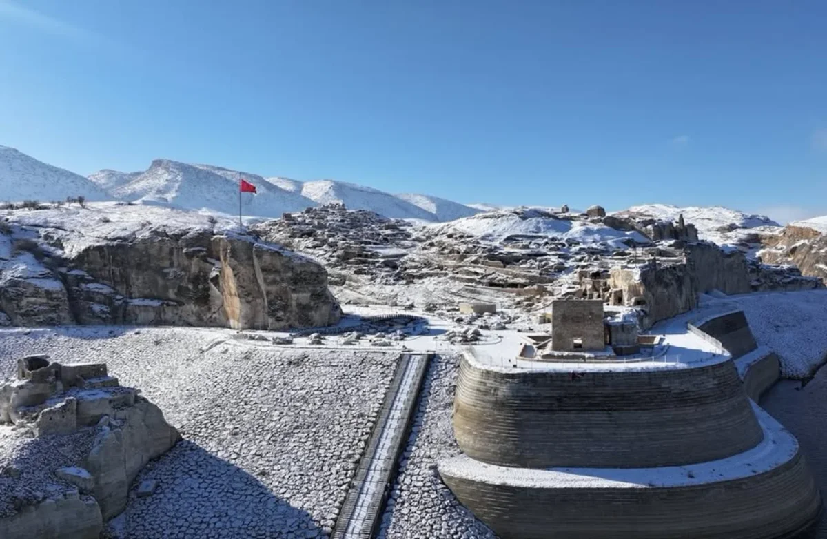 Hasankeyf Örenyeri'nde kış manzarası: Karla kaplı taş yapılar ve peyzaj kalıntıları, bu tarihi mirasın kültürel zenginliğini vurguluyor. Batman'daki bu alan, kışın sunduğu eşsiz güzelliklerle ziyaretçilerini büyülüyor!