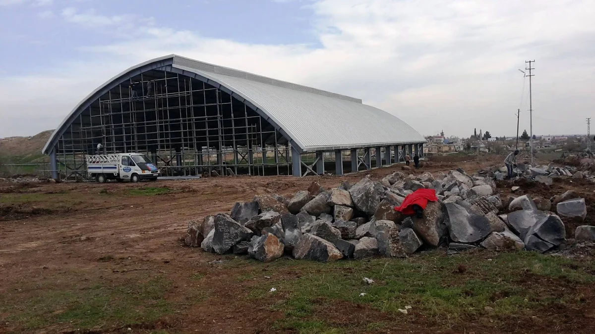 Aidesim Mozaikli Bazilikası'nın inşaat halindeki bu görünümü, yapının kavisli çatısıyla dikkat çekiyor. Kilis'teki bu dini yapı, bölgenin kültürel mirasını yansıtıyor ve restorasyon çalışmalarıyla geleceğe taşınıyor!
