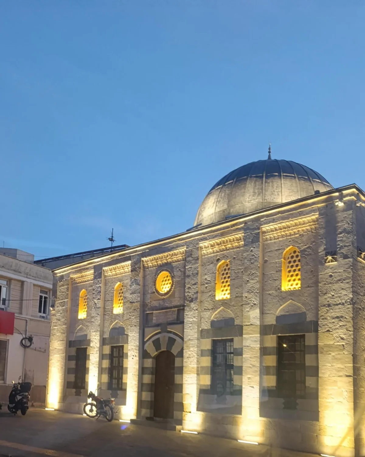 Kilis Mevlevihanesi'nin taş mimarisi, yuvarlak kubbesi ve turuncu ışıklarla aydınlatılmış dış cephesi, tarihi bir yapının modern dokunuşlarla nasıl canlandığını gösteriyor. Bisikletler bu tarihi alanın günlük yaşama nasıl entegre olduğunu simgeliyor.