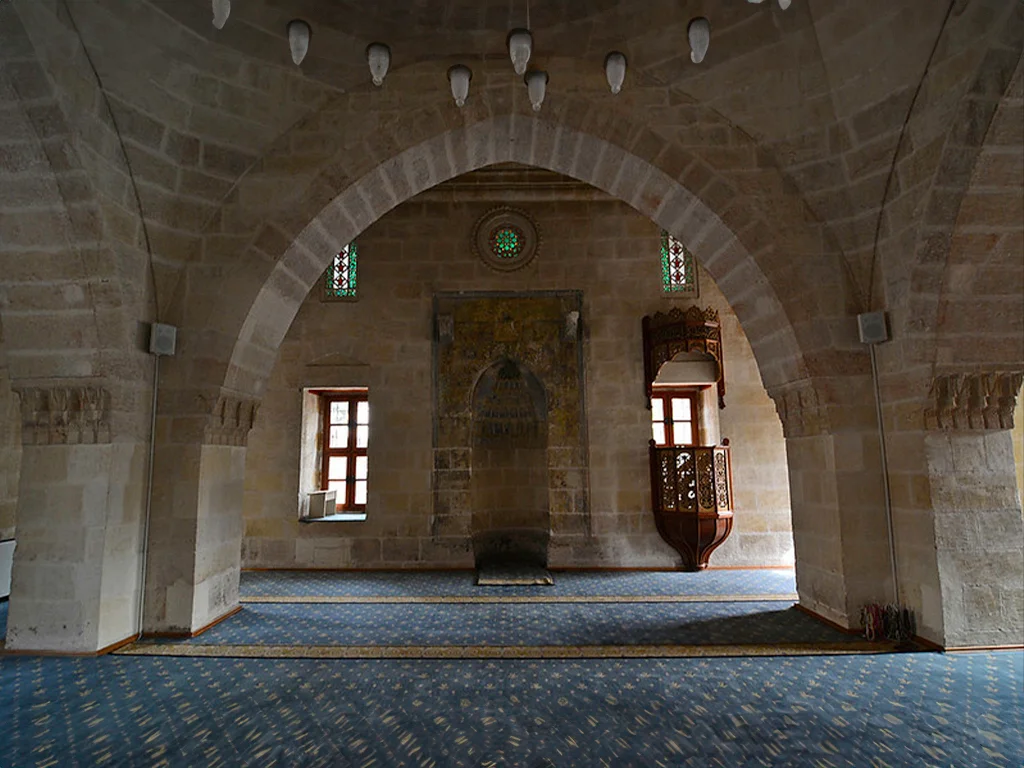 Kilis Mevlevihanesi'nin taş yapılı iç mekanındaki büyük kemerler ve renkli camlı pencereler, tarihi mimarisinin ihtişamını gözler önüne seriyor! Bu huzurlu atmosfer, Kilis'in inanç turizmi açısından önemli bir durağı.