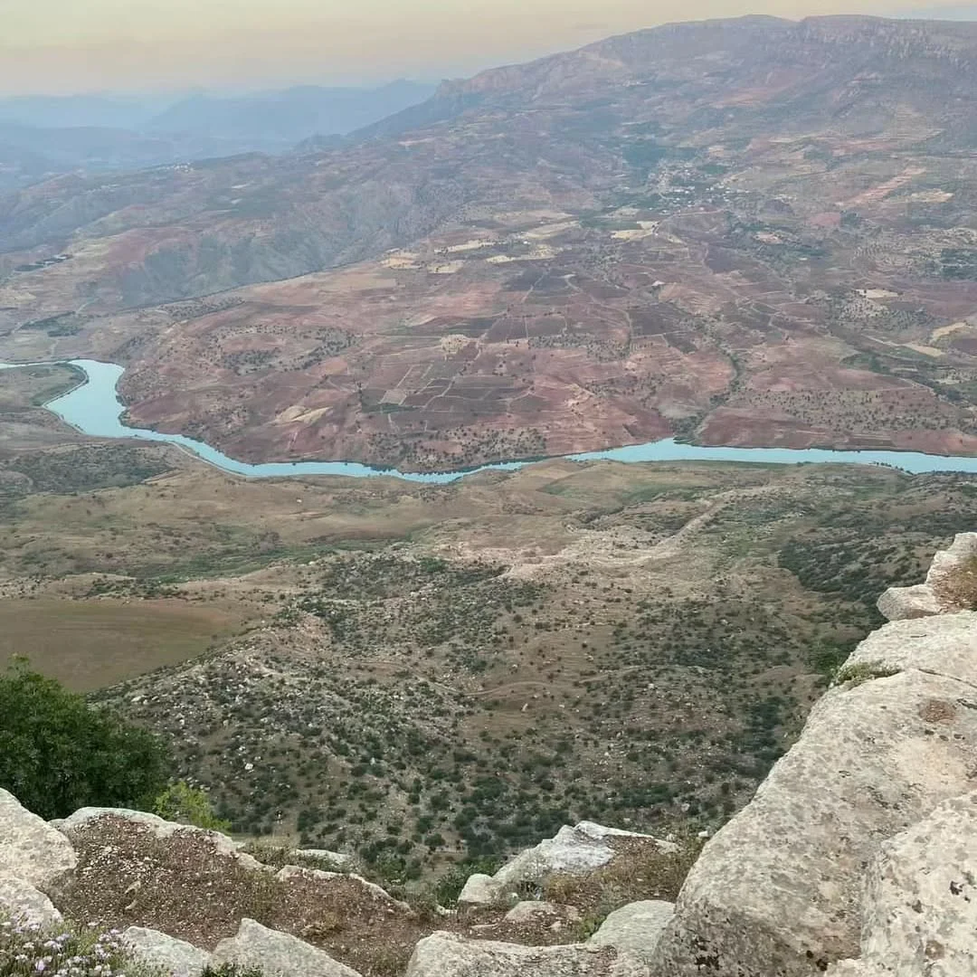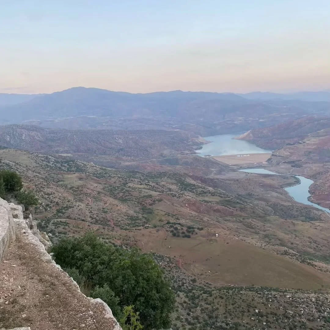 Tillo Kalesi'nden geniş vadi manzarası, kahverengi tarım arazileri ve mavi gölün etkileyici uyumuyla ziyaretçilerini büyülüyor! Bu keşfedilmeyi bekleyen destinasyon, Siirt'in doğal güzelliklerini sergiliyor.