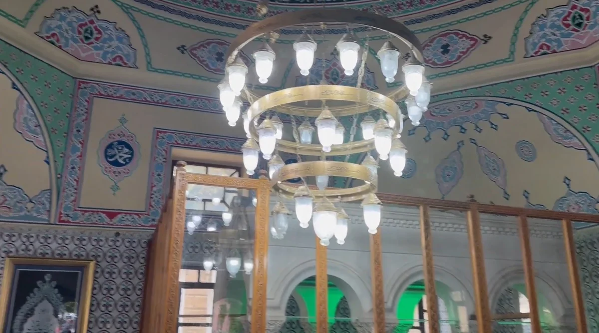 Veysel Karani Türbesi'nin iç mekanındaki bu yakın çekim, altın renkli avize ve süslü duvarlarıyla geleneksel mimarinin zarafetini yansıtıyor. İnanç turizmi için Siirt'te mutlaka görülmesi gereken bir mekan!